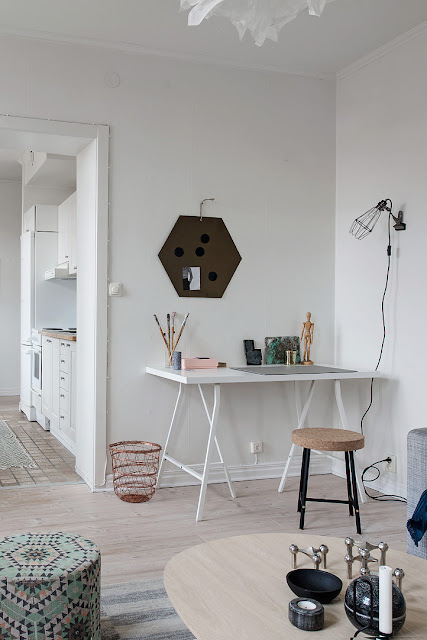 Mieszkanie ma 39m2. Dwa pokoje: dzienny, sypialnię, kuchnię oraz łazienkę. Wszystkie pomieszczenia są oddzielone, ale nie posiadają drzwi (oprócz łazienki), więc powstał tu tzw. open space. Niezawodny skandynawski styl optycznie powiększa nam wnętrze. Pomimo niewielkich rozmiarów mieszkanie wcale nie wydaje się być „ciasne”, może dlatego, że pamiętano tutaj o minimaliźmie i zaaranżowano je jedynie niezbędnymi meblami i dodatkami.