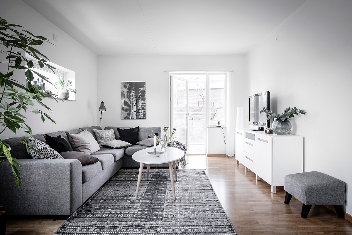 Skandynawski salon – w takim pomieszczeniu niezmiernie istotna jest sofa, w skandynawskich aranżacjach najczęściej wybierana jest tekstylna wersja, w kolorze szarości, beżu lub bieli. A przed sofą stolik, często to nowoczesny model biały na drewnianych nogach (jak na zdjęciu powyżej).