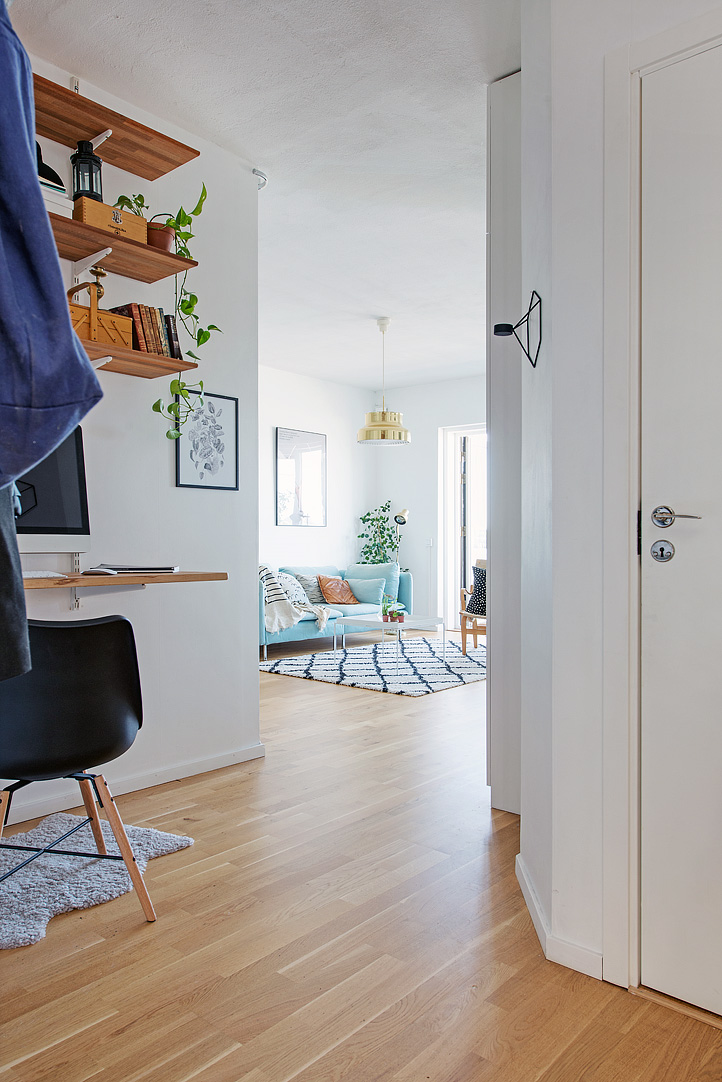 Skandynawskie mieszkanie o powierzchni 42m2. Wnętrze składa się z jednego pokoju połączonego z aneksem kuchennym i wygospodarowaną przestrzenią na sypialnię i domowe biuro oraz korytarza i łazienki.