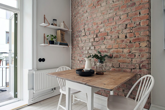 Jakiś czas temu na blogu prezentowałam Wam mieszkanie dwupokojowe, w którym charakterystycznym elementem wystroju wnętrza była ściana z cegły w aneksie kuchennym, aranżację można zobaczyć tutaj. Propozycja ta spodobała się wielu z Was zarówno na blogu, jak i facebooku. Specjalnie dla Was wyszukałam podobną aranżację. Ściana z cegły także ozdabia kuchnię. Także jest to element konstrukcji budynku.