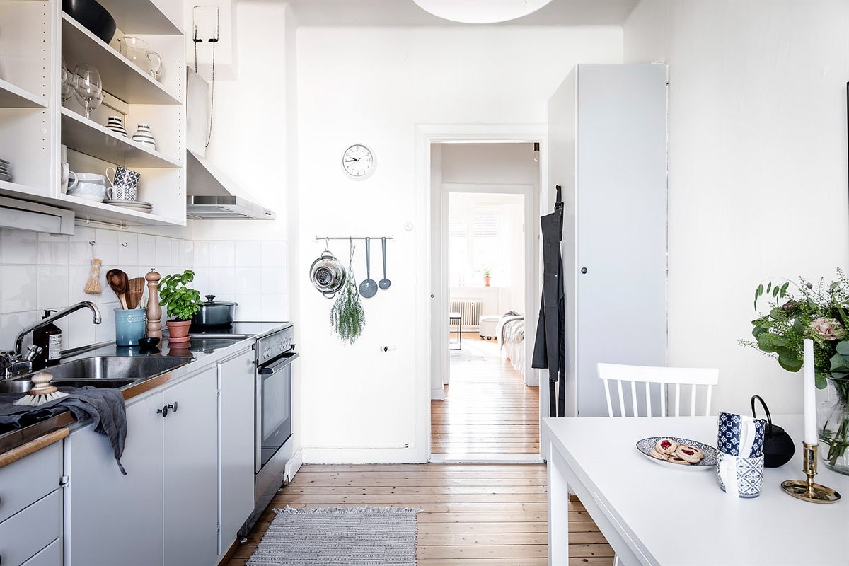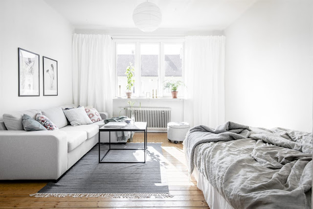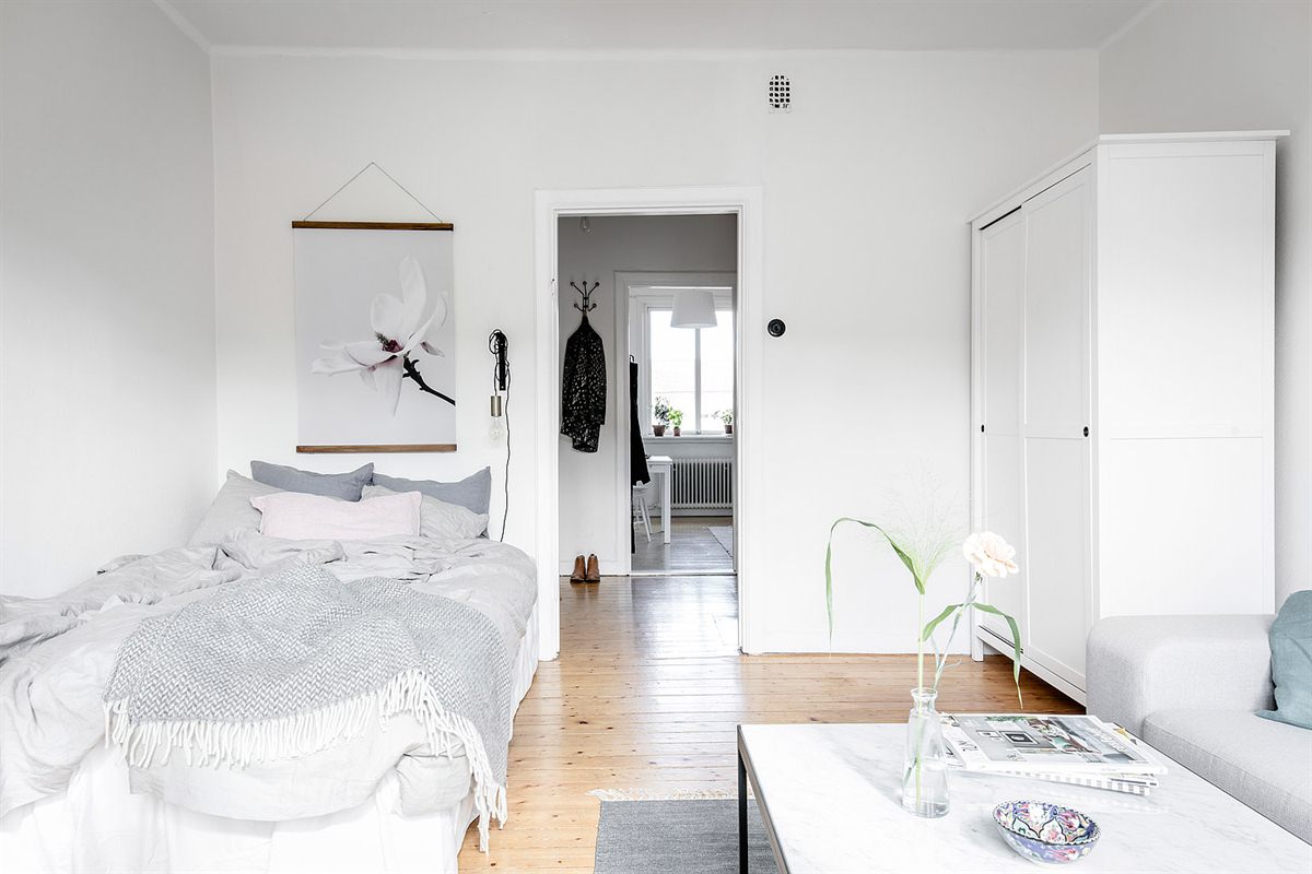 Jednopokojowe mieszkanie czyli aranżacja skandynawskiej kawalerki. Pokój spełnia funkcję dzienną i sypialnianą. Jest urządzona w minimalistycznym stylu, czyli mamy tutaj sofę, łóżko, szafę, stolik, dywan, zasłonki, pufę i obrazki. Ściany są białe, podłoga beżowa – drewniana, meble szare i białe, inna kolorystyka pojawia się w poduszkach i … roślinach.