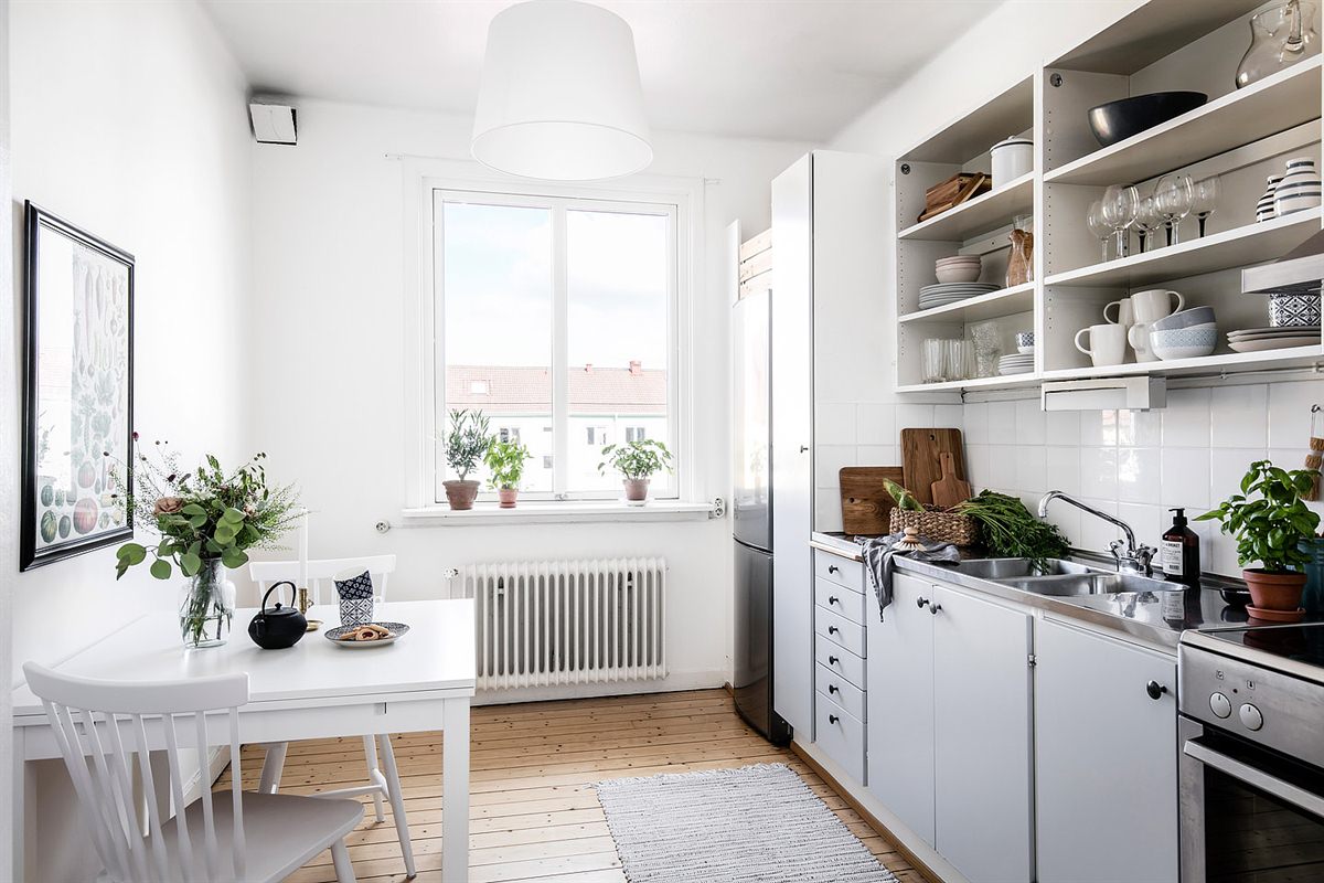 Jak to w kawalerce pokój jest tylko jeden, jednak w tym małym mieszkaniu jest także kuchnia i łazienka. Kuchnia biała można by stwierdzić, że w typowo skandynawskim stylu, z przewagą bieli, łazienka „dość ekonomiczna”, czyli dla niektórych mogła by być uznana za „nadającą się do remontu” 🙂