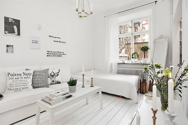 Ta kawalerka ma zaledwie 20 m2. Pomimo to stworzono przyjemną przestrzeń do życia dla jednej osoby (wnioskuje to po wielkości łóżka). Wnętrze to urządzono z użyciem monochromatycznych kolorów, przewaga bieli.