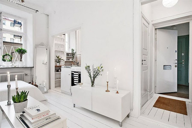 Sekret to duża ilość bieli, meble dobrane do wielkości mieszkania (wąska szafa, zobaczcie jak układane są w niej ubrania) oraz minimalna kuchnia i łazienka, tak aby jak najwięcej miejsca zostało na pokój dzienny (zresztą to sekret budownictwa wielorodzinnego z lat 70 – tych). Jednak mała kuchnia zmusiła lokatorkę tego mieszkania, aby umieścić lodówkę w pokoju, pewnie dlatego postawiono na jej design! To mieszkania znajduje się w stolicy Szwecji!