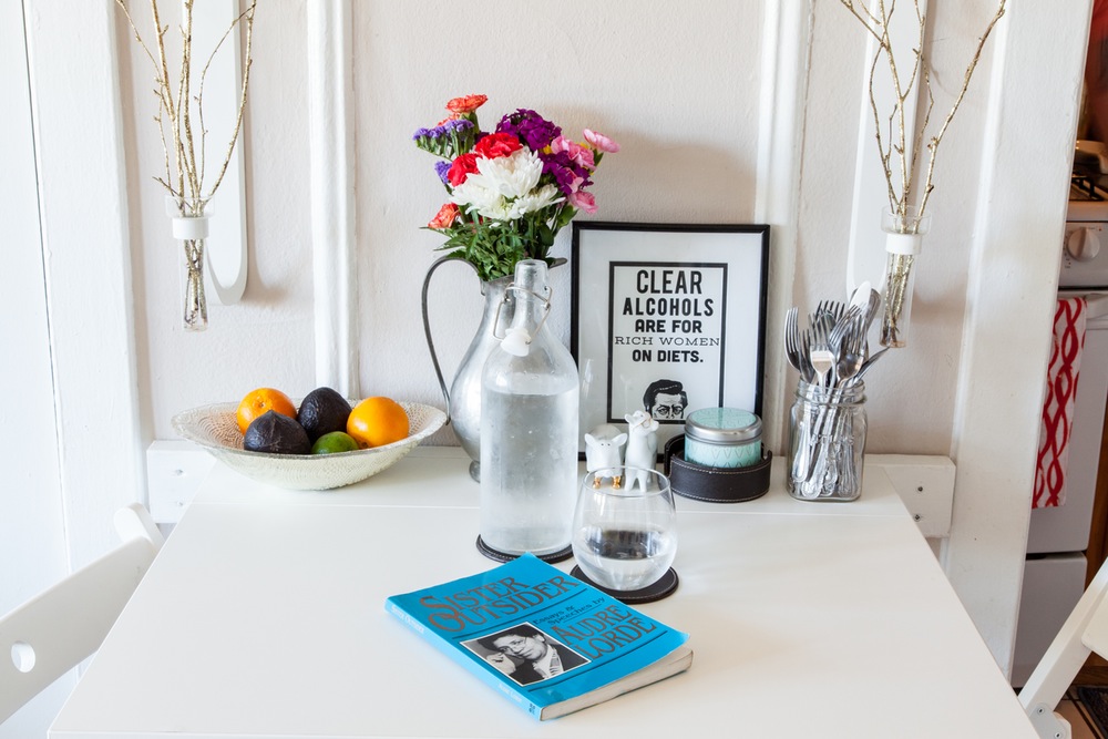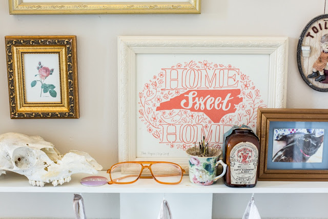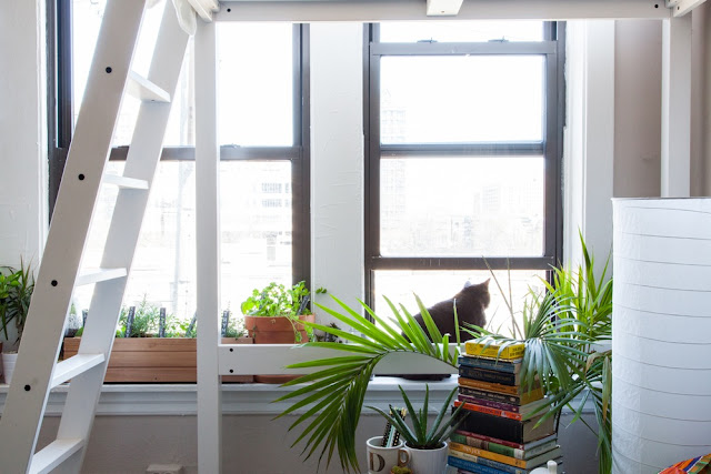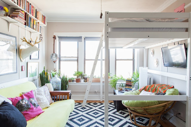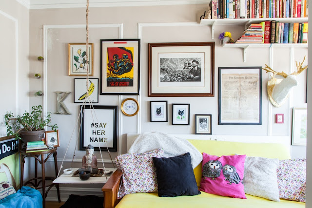 Nie wiem dlaczego ale zazwyczaj wnętrza nasycone tak mocno różnymi elementami nie podobają mi się. Tutaj o dziwo wszystko ma swoje miejsce: półki, na ścianach obrazy, lustra, i inne dodatki. Wszystko współgra ze sobą bardzo dobrze. Powroty z pracy do takiego mieszkania muszą być naprawdę kojące. Nie mogę się napatrzeć:)