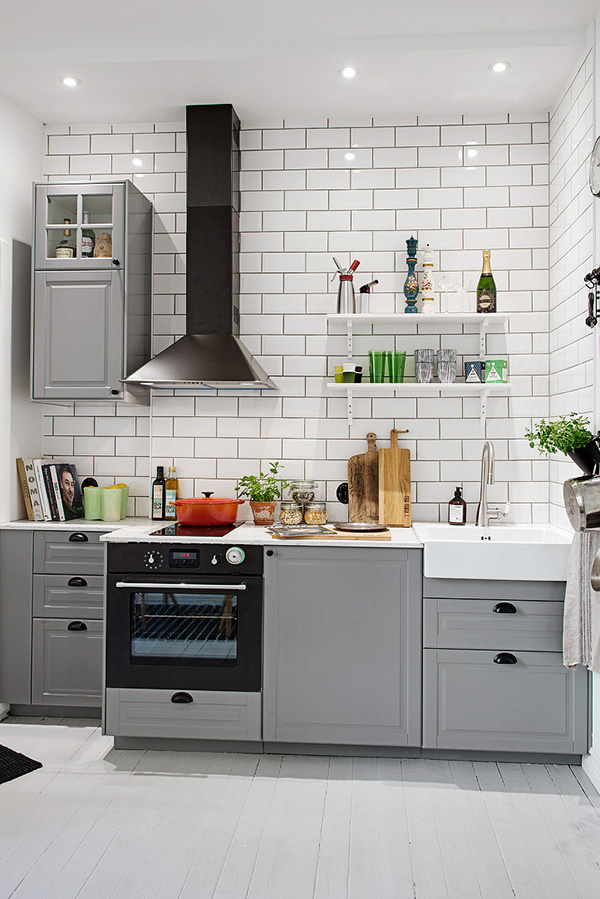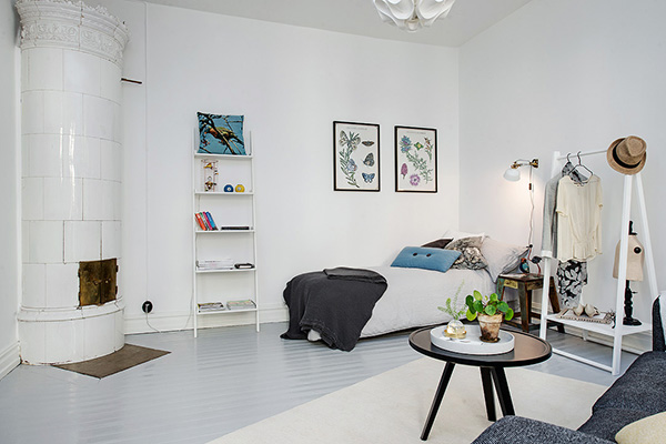 Jeśli szukacie pomysłu jak urządzić małe mieszkanie, to niezastąpiony jest skandynawski styl. Oceńcie zresztą sami 😉 Mieszkanie ma 32m2, jeden pokój łączący funkcje dzienną i sypialnianą. Subtelne dodatki: obrazki (postawiane nie powieszone), wieszak na ubrania, drabinka z książkami i magazynami (podobna jest w łazience). Przedłużaniem niewielkiej przestrzeni jest balkon. Wydaje mi się, że niełatwą przestrzeń do aranżacji (czyli kawalerki ok. 30m2 powierzchni) mieszkańcy Skandynawii opanowali sztukę jej urządzania i dekorowania perfekcyjnie!
