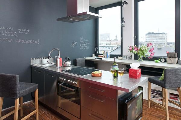 Wracając do aranżacji to 36m2 świetnie zaprojektowanej przestrzeni. Pomimo niewielkiego metrażu znalazło się tutaj miejsce na łóżko, sofę rozkładaną oraz przestronny aneks kuchenny. Fajnie wygląda ściana kredowa, na której można zapisywać „złote myśli” i „sprytnie schowany” telewizor pod blatem kuchennym. Drzwi szklane także świetnie sprawdzają się w małych mieszkaniach, za nimi kryje się niewielka, ale dobrze rozplanowana łazienka!