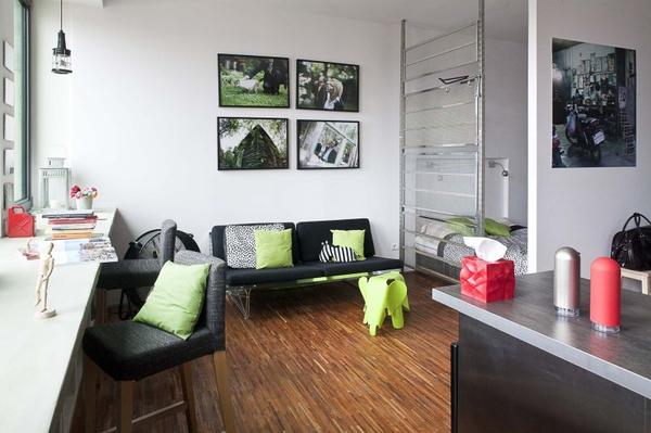 Mieszkanie jednopokojowe – kawalerka położone w Łodzi przy ulicy Piotrkowskiej w budynku z tzw. „wielkiej płyty”. Znalazłam tą aranżację „kiedyś w internecie” i niestety nie zapisałam źródła zdjęć oraz nazwy pracowni architektonicznej, która „stoi za tą pracą”. Jeśli wiecie coś więcej,  dajcie znać w komentarzach.