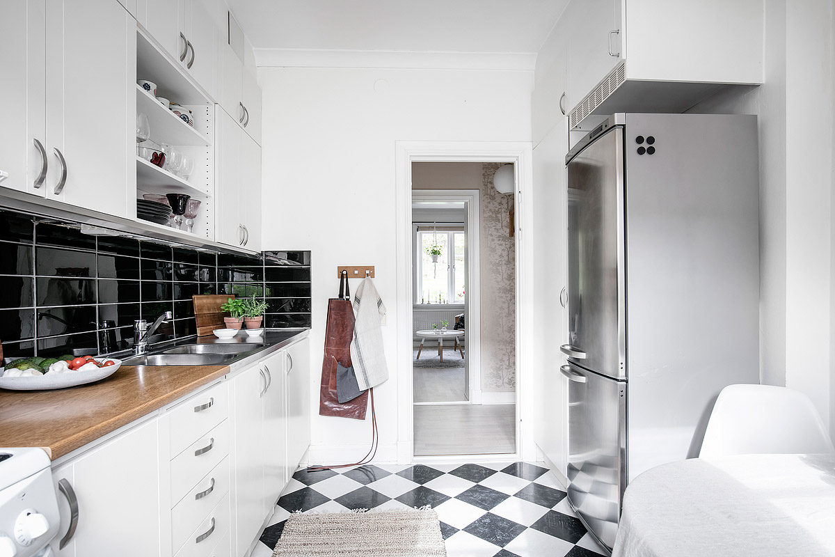 Biały kolor szafek kuchennych i podłogi przełamano czernią, w postaci kafelków na ścianie oraz podłogi.