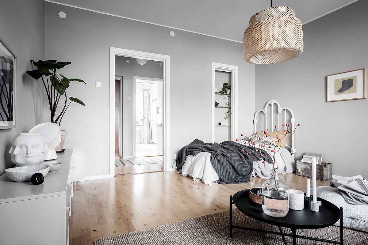 przykład (jak w przypadku tej 34m2 kawalerki) dekoracyjna rama łóżka, duży kwiat – ozdobny kaktus,