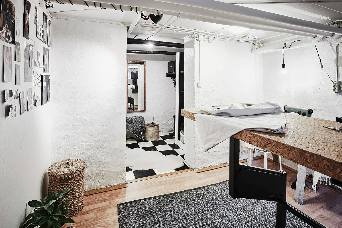 Jak tyle pomieszczeń „zmieściło się” na tak niewielkiej powierzchni? Sekret tkwi w tym, że pracownia krawiecka znajduje się w piwnicy. Jest tam duży stół do projektowania i krojenia, maszyna do szycia, projekty na ścianach oraz wieszaki na gotowe ubrania.