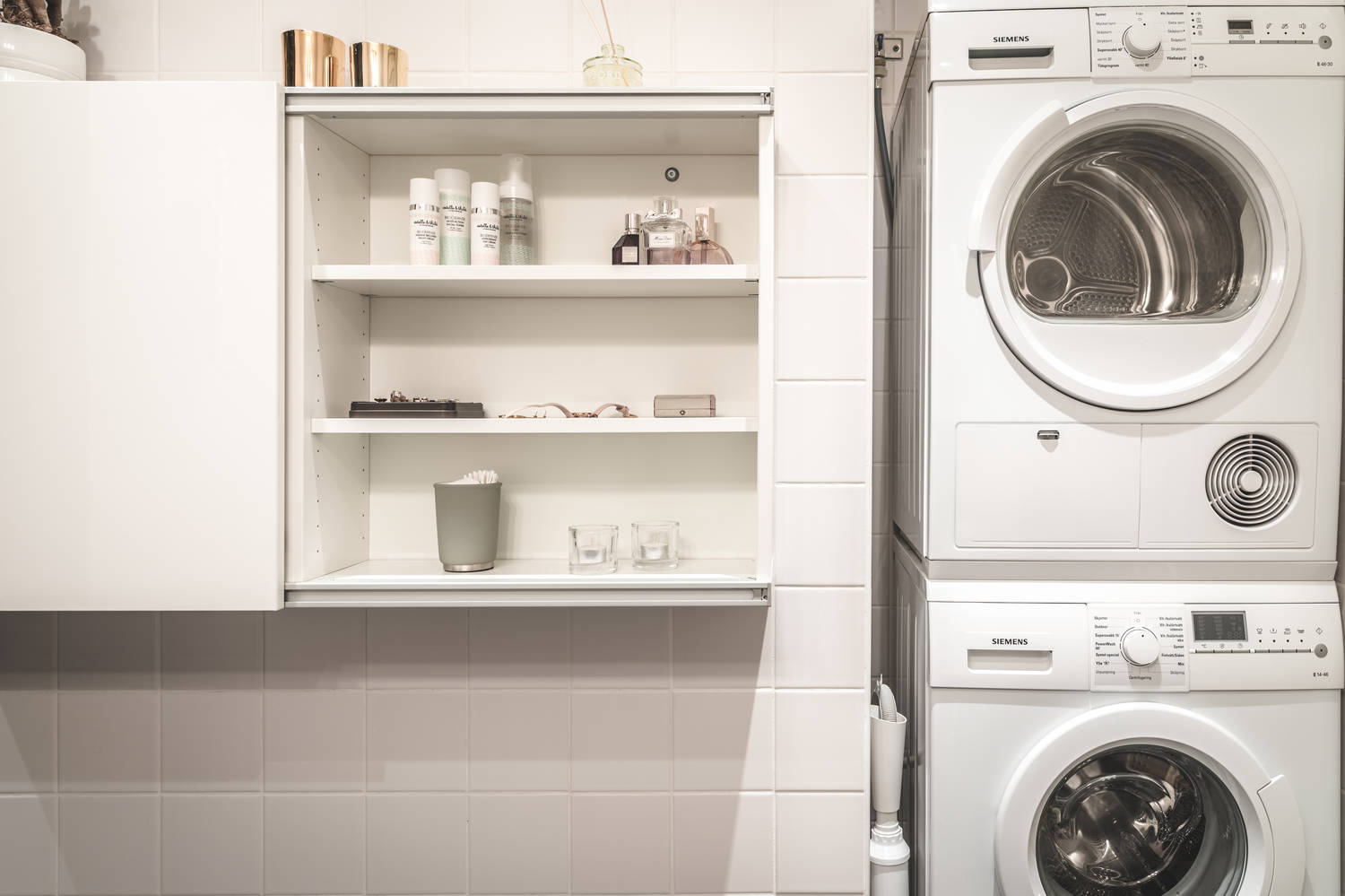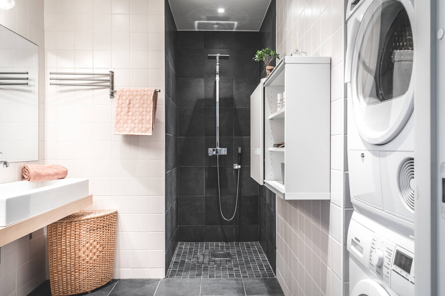 Sypialnia jest niewielka, ale świetnie wykorzystano każdy centymetr powierzchni. Jak na jednopokojowe mieszkanie to stosunkowo duża jest łazienka w tonacji biało-szarej. Zmieściła się tutaj także pralka i suszarka (co prawda ustawione jedne na drugiej), co rozwiązało problem suszenia ubrań na małej powierzchni!
