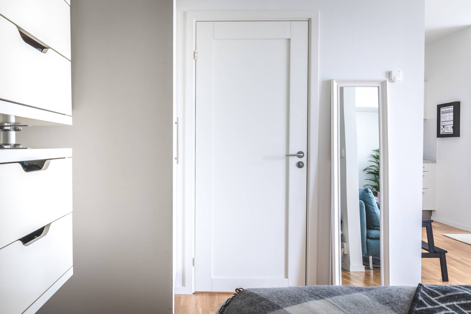 „Kawalerka z sypialnią” czyli jak w jednopokojowym mieszkaniu wygospodarować przestrzeń do spania. Mieszkanie ma powierzchnię 39m2, położone jest na parterze. Mały metraż idealnie „kamufluje” biel, a miejsce do przechowywania stworzone zostało z dużej ilości szafek (także białych), wykończonych z płyty na wysoki połysk.