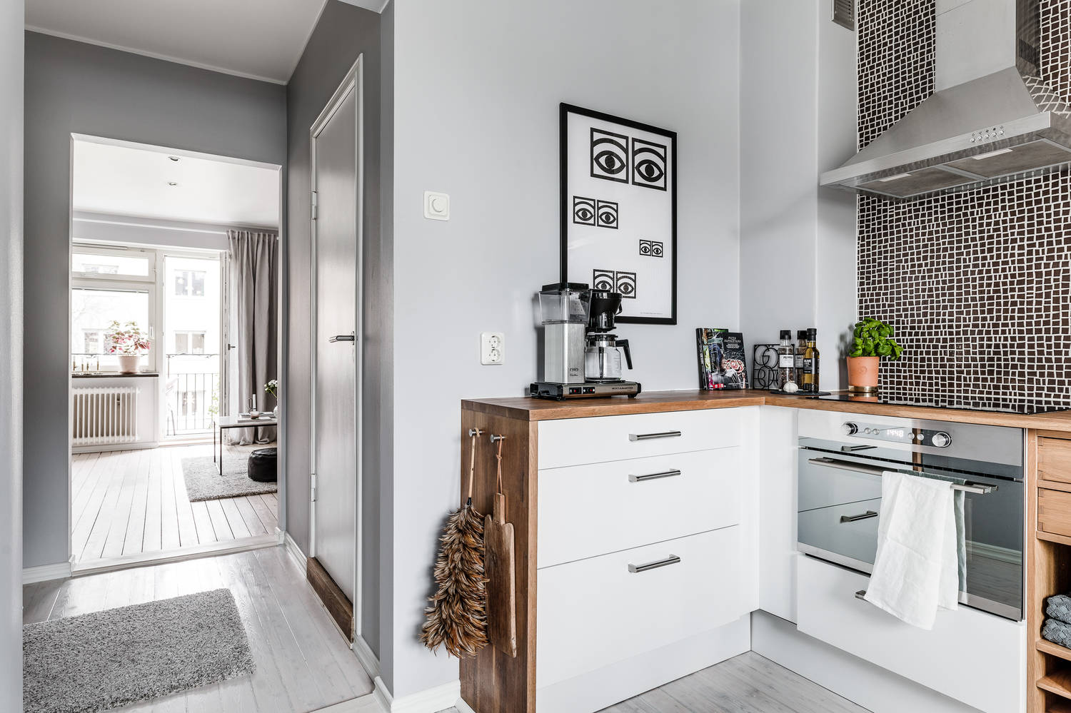 Wygląda wspaniale, w kuchni jak i balkoniku można się zakochać! Dodatkowo świetnie dobrane odcienie szarości i bieli.