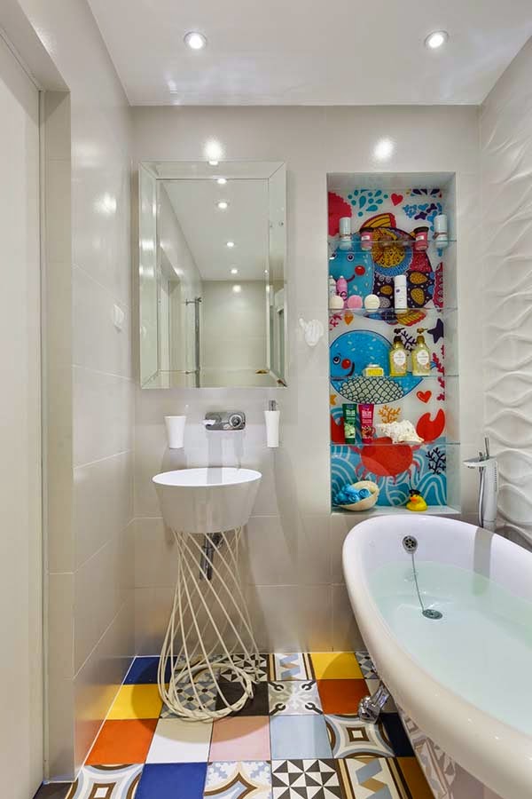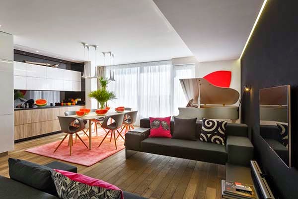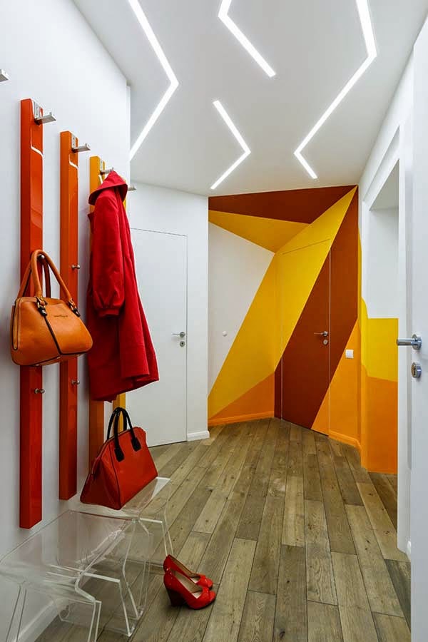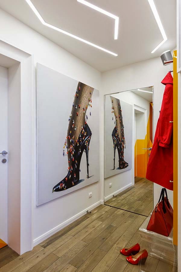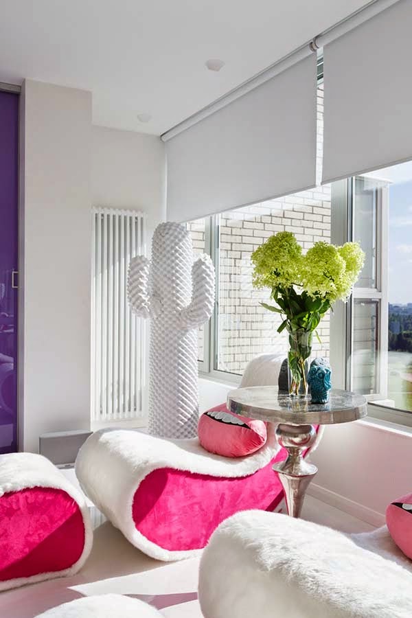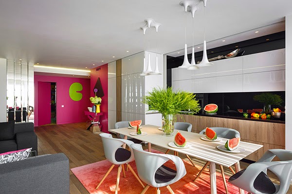 Kolorowe mieszkanie położone w Petersburgu, Rosja.  Ma 230m2 powierzchni i powstało z czterech mieszkań. We wnętrze zastosowano dużo świeżych barw: amarant, żółć, turkus. Są także klasyczne kolory, kuchnia położona w aneksie jest w czarno – biało – beżowych barwach. Oryginale są także ozdoby: sprzęty grające, figurka w kształcie kaktusa, siedziska obite pluszem. W mieszkaniu pojawiają się zarówno łuki (np. w pokoju dziecka), a także „kąty proste” (jak okleina na drzwiach w przedpokoju). Jest to propozycja dla osób, które lubią we wnętrzu kolorowo i mają dystans do przedmiotów, którymi się otaczają 🙂