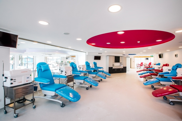 Biel połączono z nasyconymi barwami: niebieski, zieleń i pomarańcz. Duże, jasne i „przeszklone” pomieszczenia. Ktoś chętny na oddanie tutaj swojej krwi?