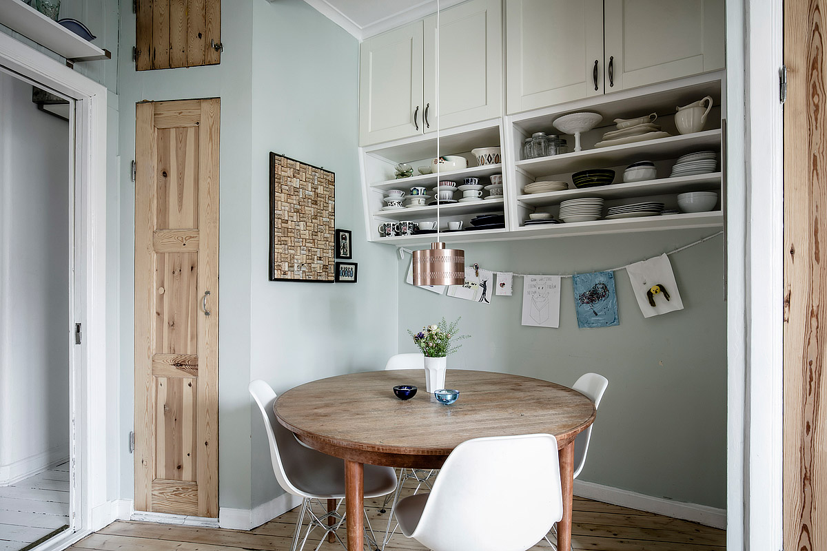połączone z drewnianymi blatami. Fronty szafek są ozdabiane. Ściany zdobią cegła, drewniane panele oraz białe kafelki także przypominające białą cegłę.