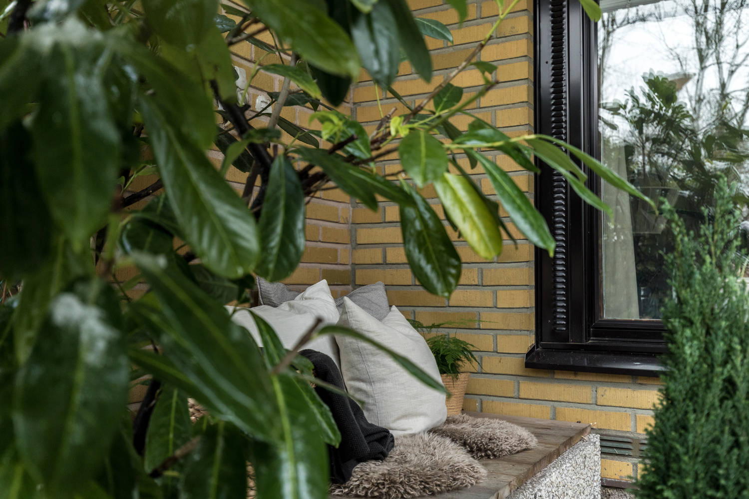 Taras jest w tym przypadku adekwatny do wielkości pomieszczeń, zmieściła się duża miękka sofa oraz mała ławeczka/ miejsce do siedzenia ozdobione miękkimi poduszkami.