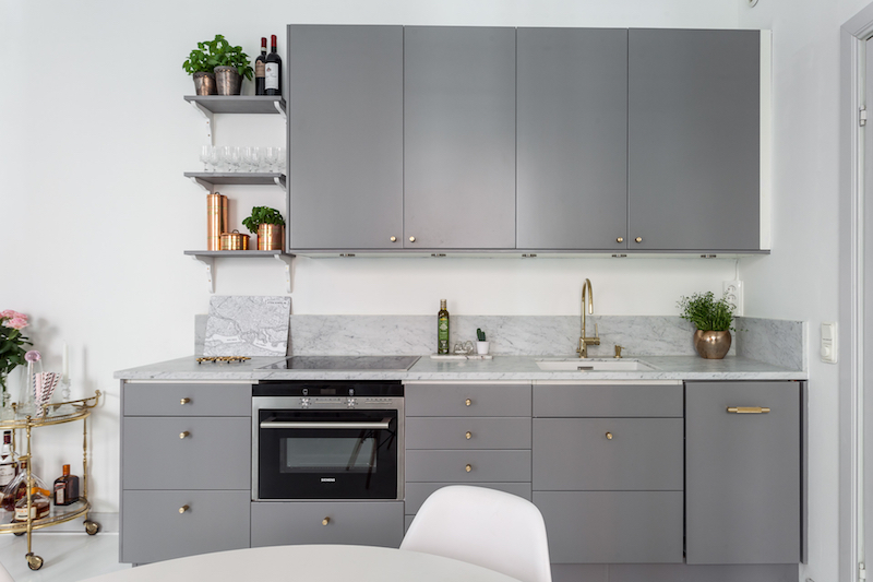 Jasne dwupokojowe mieszkanie o łącznej powierzchni 52m2. Aneks kuchenny niewielki, szafki w kolorze szarym i aluminiową lodówką zabudowaną. Biały okrągły stół z czterema krzesłami Eames. Szara sofa tekstylna oraz zdobne krzesło tworzą „kącik wypoczynkowy”.