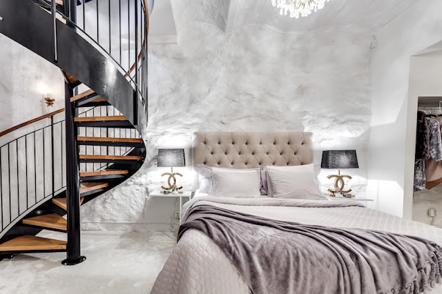 Na poziomie -1 czyli w piwnicy sypialnia i garderoba. Widać, że właścicielka jest miłośniczką mody, torebki (Chanel, Louis Vuitton), lampy z logo Chanel oraz grafika z logo Prada w garderobie.