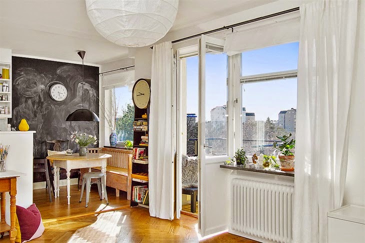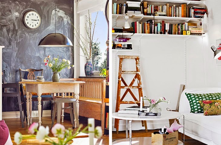 To mieszkanie jest niewielkich rozmiarów, jednak mimo to właściciele postanowili całą ścianę w pokoju dziennym zapełnić książkami. Trzeba przyznać, że dodaje to charakteru wnętrzu tak samo jak kredowa tapeta obok stołu 😉