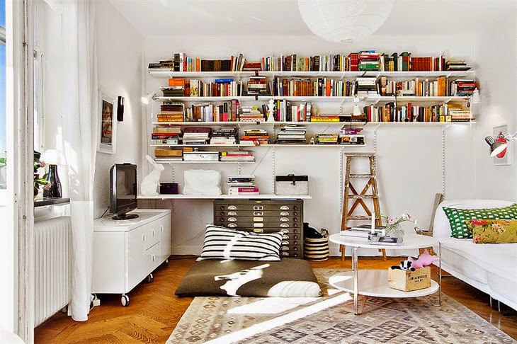 Faktycznie może nie jest bardzo dużo, ale w tak małym mieszkaniu cała ściana jest ozdobiona półką z książkami, to może oznaczać, że mieszka tu miłośnik literatury 😉