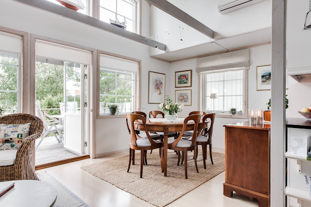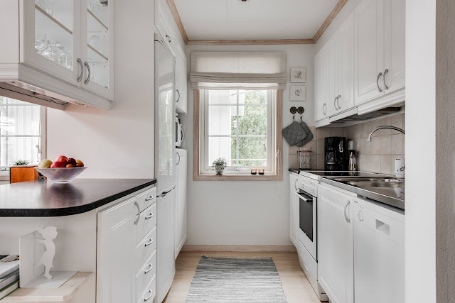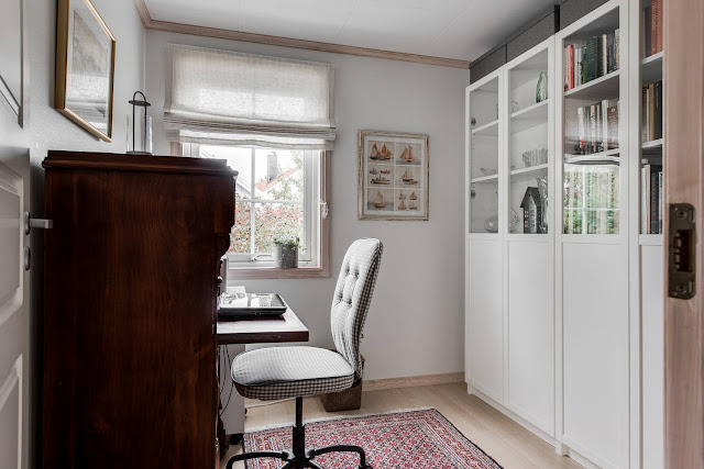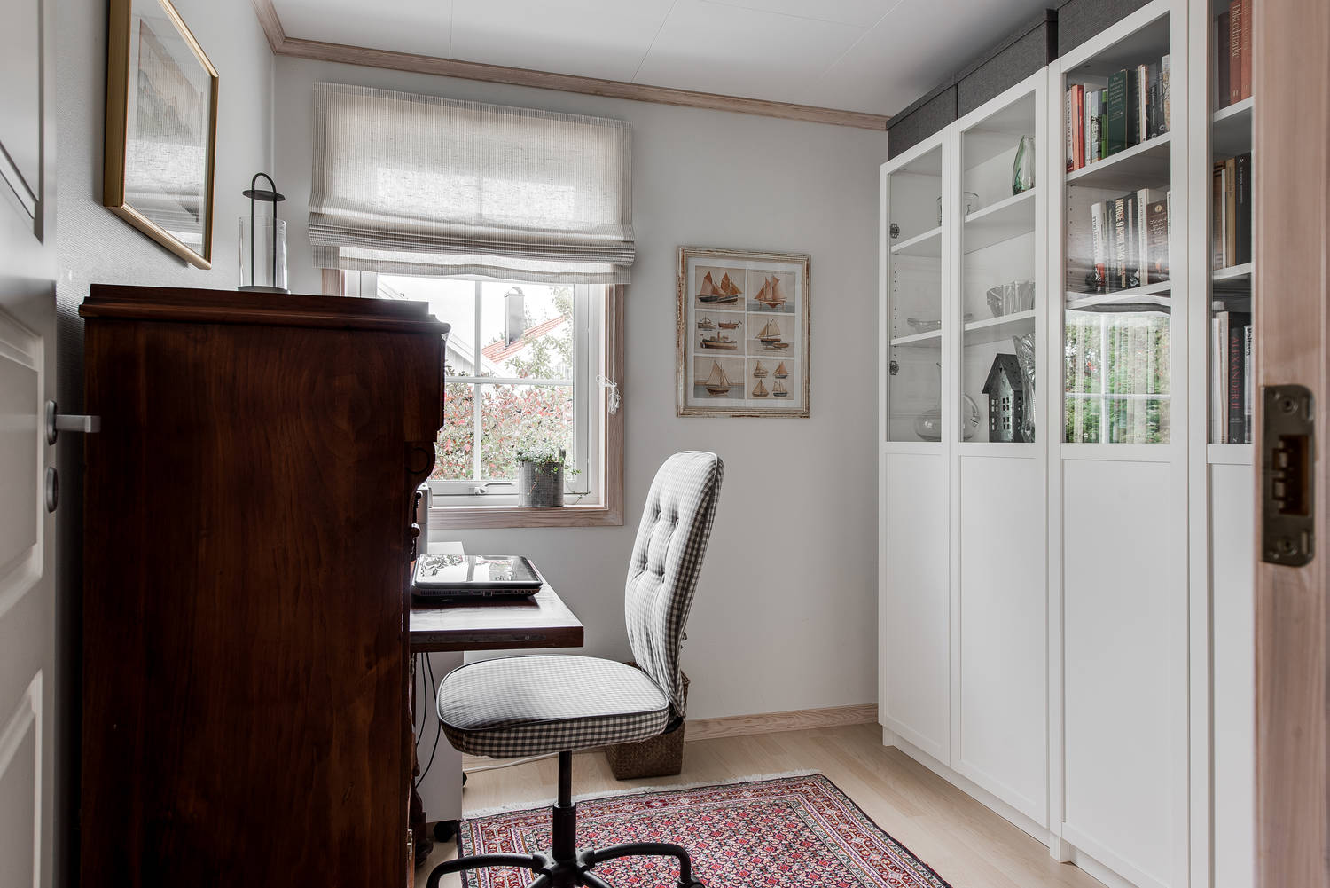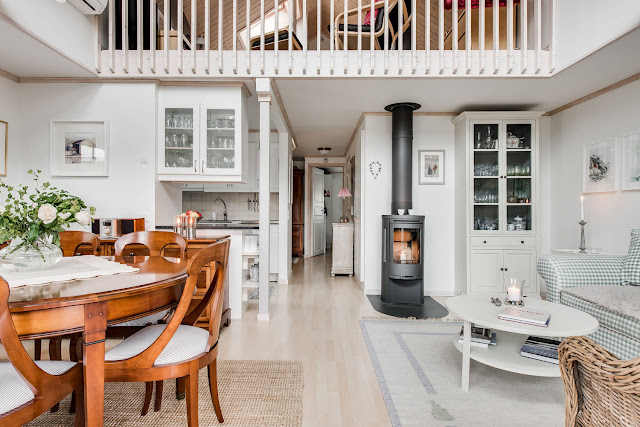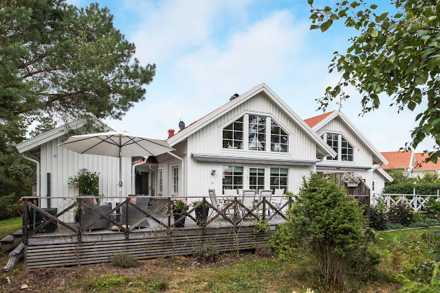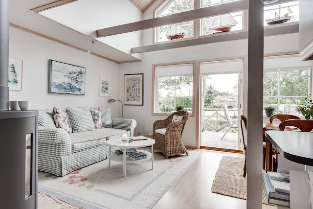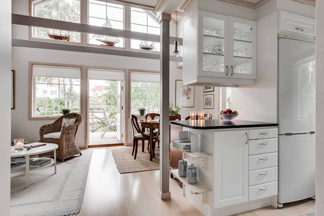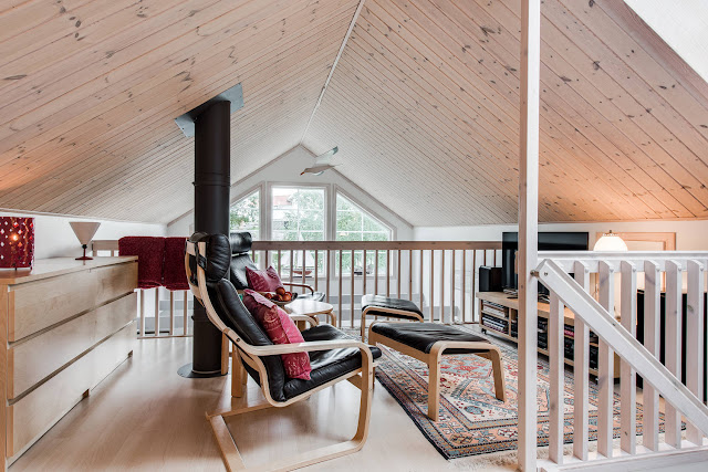 Mały dom o powierzchni 92m2 z antresolą. Pięknie położony na osiedlu doków jednorodzinnych przy szwedzkim wybrzeżu (zdjęcie powyżej). Dzięki zastosowaniu antresoli (oraz jasnych barw) niewielki salon jest przestronny i przytulny. Zresztą w podobnej stylistyce są wszystkie pomieszczenia (sypialnia, korytarz spełniający funkcję tv – na górze, domowe biuro, łazienki, aneks kuchenny,kolejna sypialnia – na dole). Dom nie jest duży, ale myślę, że idealny dla małżeństwa czy pary lub nawet małżeństwa z dzieckiem, którzy pragną spokoju ….