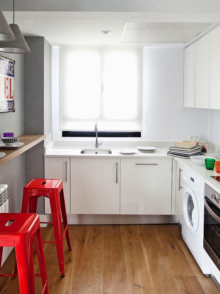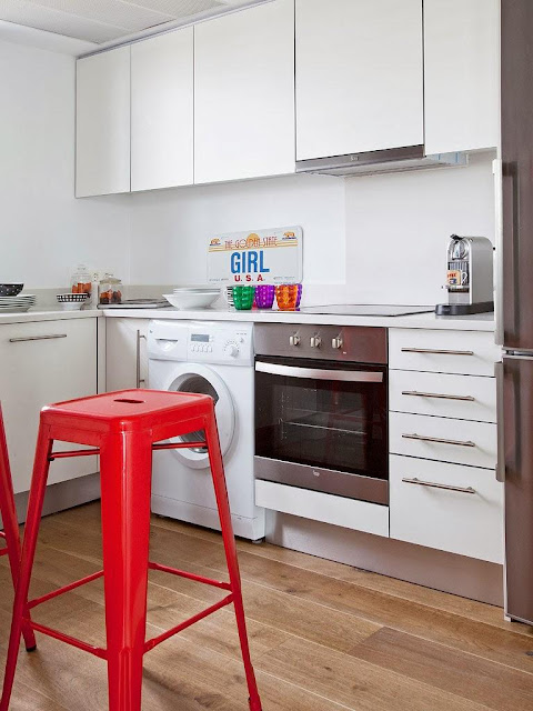 dwa kontrastowe czerwone stołki.