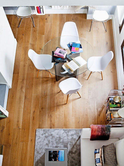 stylu. W dalszej części pokoju umieszczono okrągły szklany stół oraz cztery krzesła Eames.