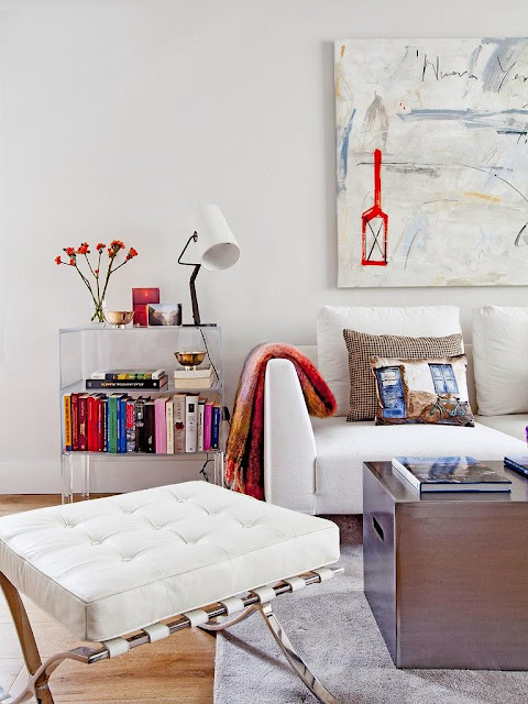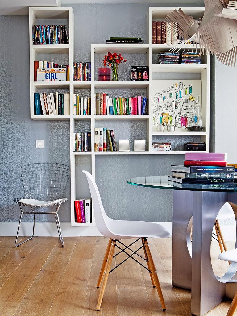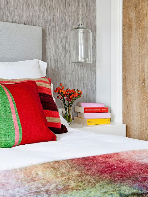 kolorowe książki. Wnętrze zdobi także stojąca lampa w industrialnym