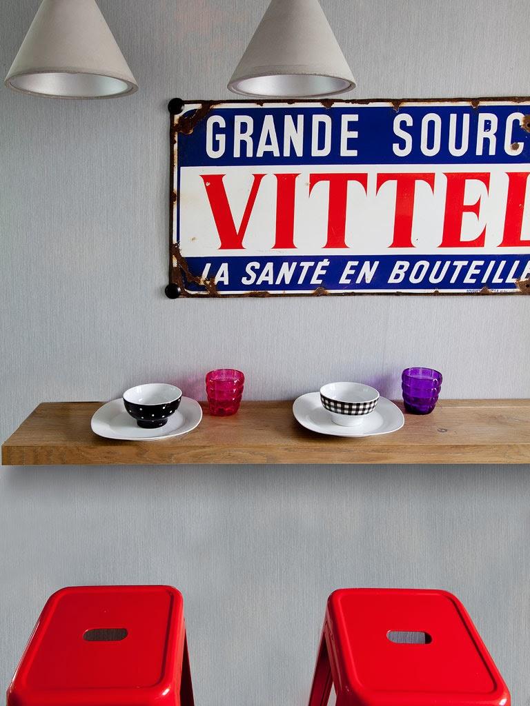 kuchenne, a także szara ściana przy której umieszczono drewniany blat i