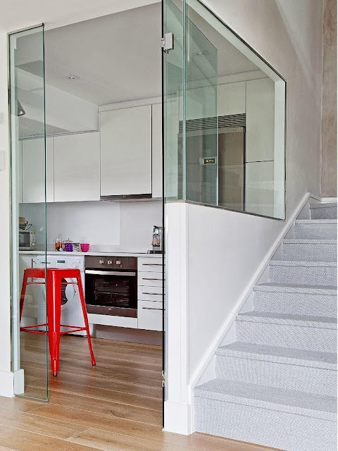 szklanymi drzwiami umieszczono kuchnię, w niej dominują białe szafki