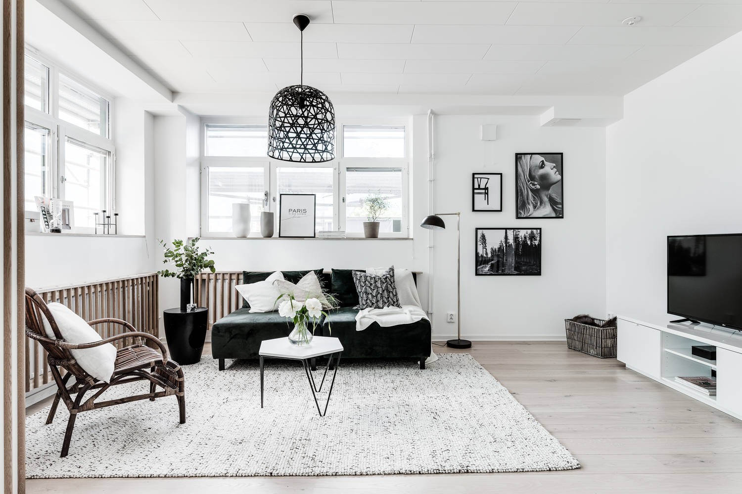 Bazę wnętrza stanowią meble z sieciówki, białe ściany oraz bielone panele na podłodze. Ciekawym rozwiązaniem jest osłona kaloryfera z drewnianych paneli oraz takie samo wykończenie wyjścia na balkon, które pełni jednocześnie funkcję wiatrołapu.