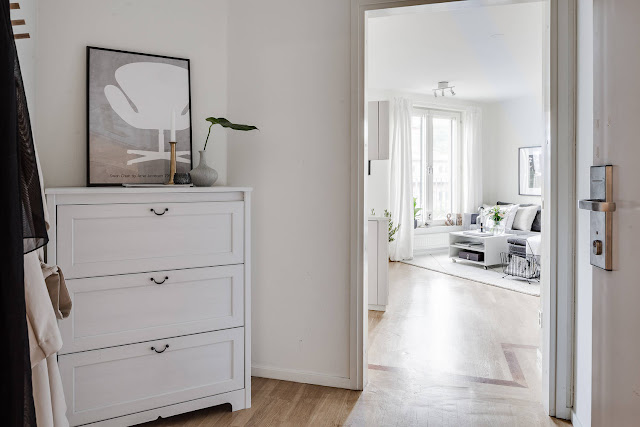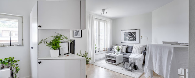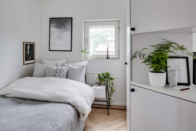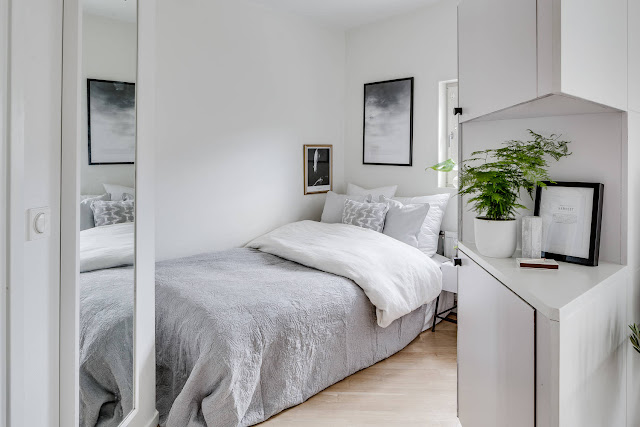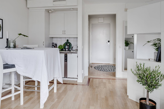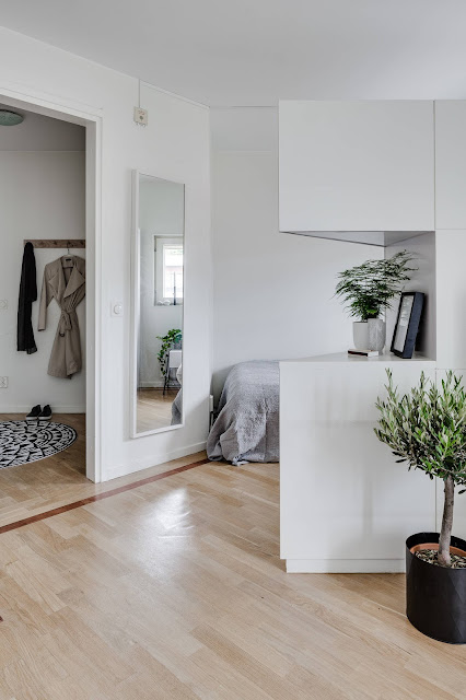Warto także zwrócić uwagę na to, że dobór kolorów także optycznie powiększa przestrzeń. Jasne barwy to zawsze dobry pomysł w małym mieszkaniu. Do tego świetnie wydzielona przestrzeń na sypialnię – szafkami, nie zmarnowano żadnego metra w tej kawalerce!