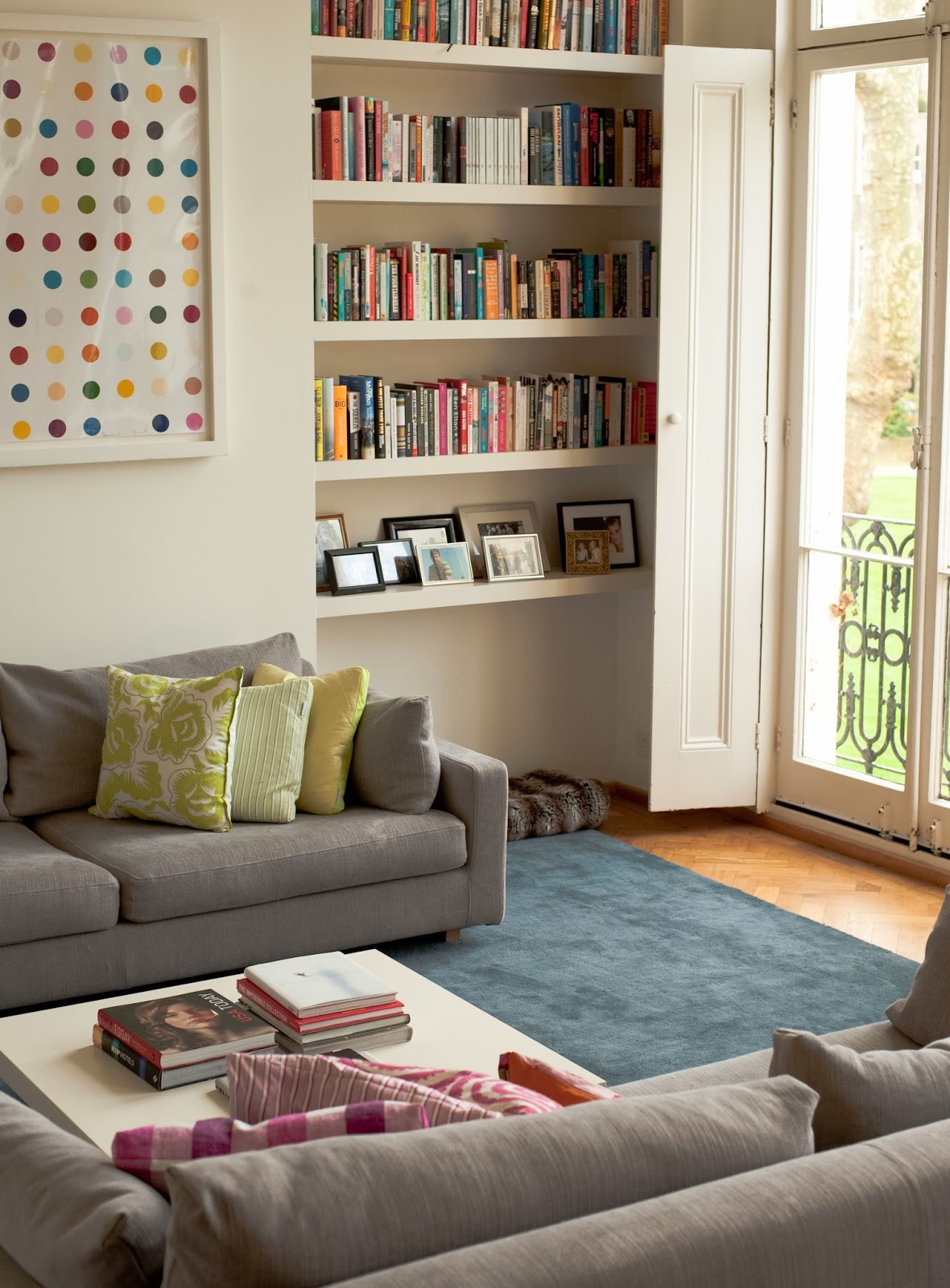 Jak urządzić mieszkanie dla 4-osobowej rodziny, by było nowocześnie i przytulne ? Prezentuje jeden z pomysłów. Mieszkanie położone w Londynie. Wysokie pomieszczenia i klasyczna kolorystyka. Jasne ściany, szare kanapy i białe meble. Kolorowe dodatki dodają wnętrzu „zwariowanego charakteru”. Na uwagę zasługuje zielona łazienka i obrazki, to aranżacja pomysłu, który pokazywałam w ostatnim poście, czyli ramki ze zdjęciami ze strony Instadruk.