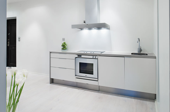 Kuchnia wręcz skromna. Tak bardzo minimalistyczne mieszkanie, jak by jeszcze czegoś w nim brakowało