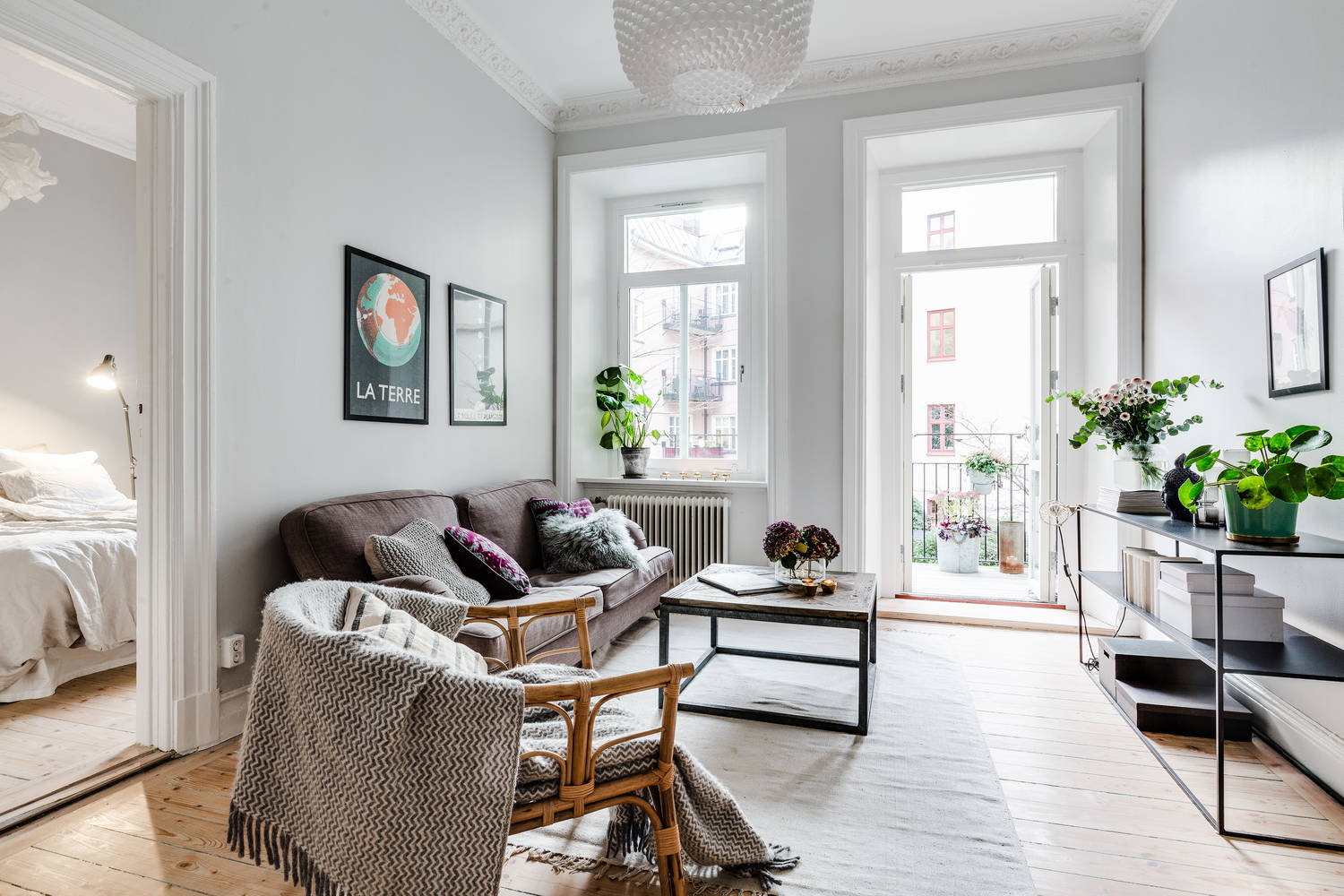 Salon to jasno szare ściany i drewniana podłoga, obrazki w czarnych ramach, a także dodatkowa powierzchnia czyli przytulny balkon. Jak to w skandynawskich aranżacjach wnętrze ocieplają dodatki: książki czy miękki pled.