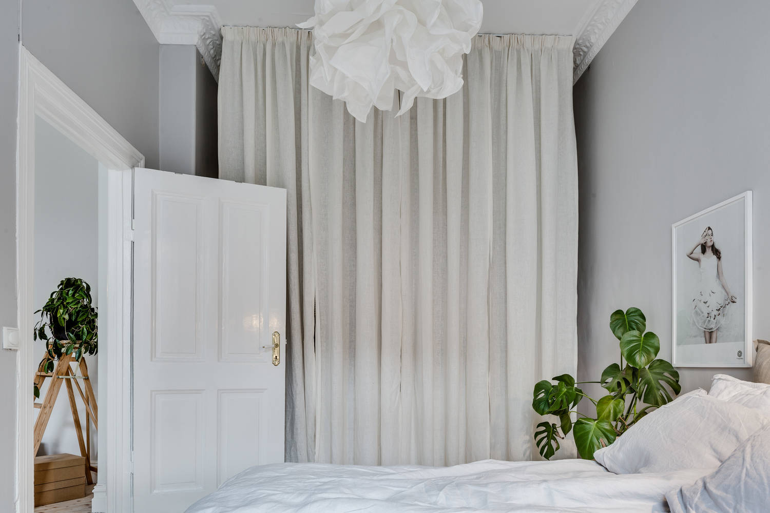 Sypialnia to miejsce przytulne, gdzie główny mebel to łóżko ozdobione pościelą z naturalnym materiałów. Nad łóżkiem powieszono obrazki, a miejsce do przechowywania ubrań zasłonięto jedynie miękką tkaniną.