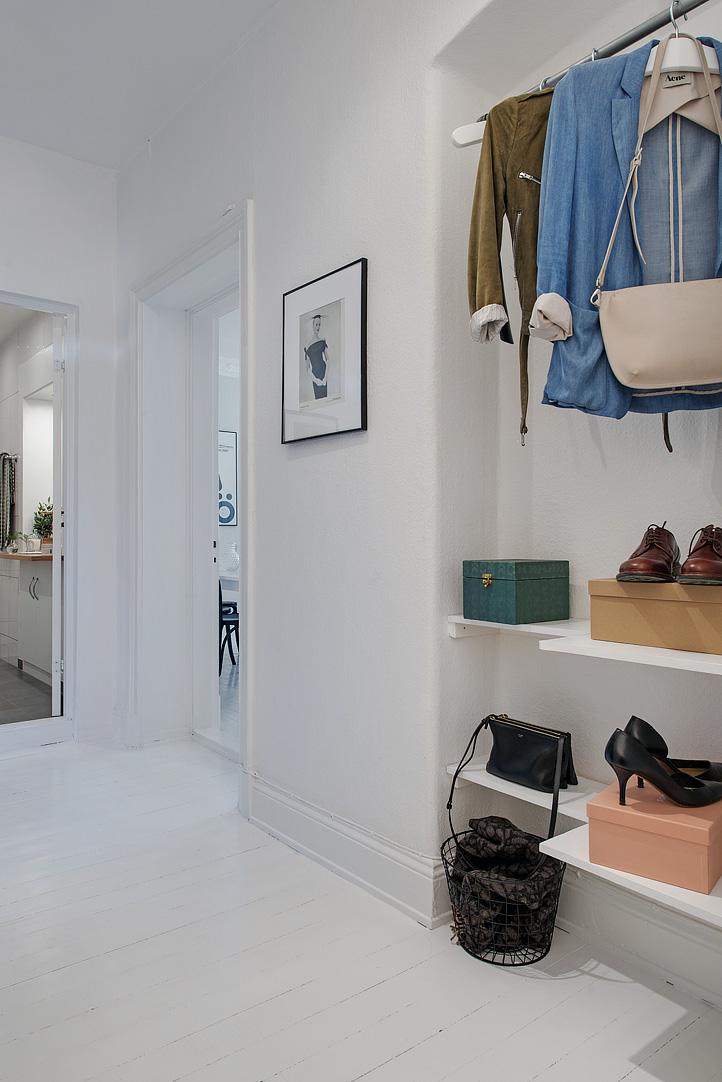 W sypialni dużo światła, łóżko i szafa. Łazienka biało-szara z półkę drewnianą, na której stworzono miejsce na kosmetyki. W przedpokoju stworzono garderobę tanim kosztem, czyli za zasłoną