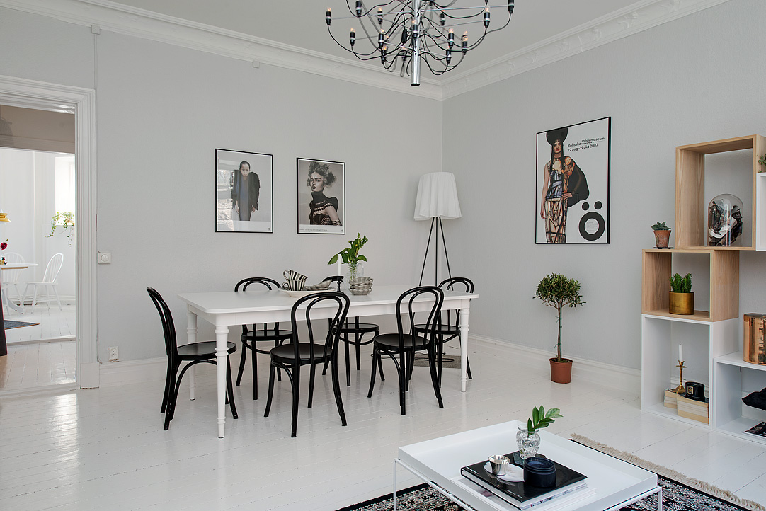 Pokój dzienny oczywiście w jasnych barwach z przewaga jasnej szarości, bieli i beżu. Interesujący mebel to regał, na którym umieszczono rośliny w ozdobnych doniczkach, książki, świece i designerską figurkę świnki. Oprócz typowych mebli do salonu: sofa, stolik i regał, umieszczono tutaj także duży stół z sześcioma krzesłami, a przestrzeń wypełniono ramkami – grafikami.