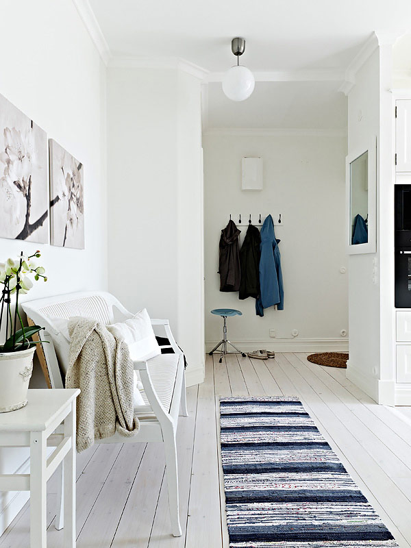 Mieszkanie zdobią także subtelne obrazki, które także znajdziecie w ofercie sklepu Fototapety na wymiar. Charakteru nadaje także drewniana podłoga, ozdobny żyrandol w saloonie, a także zadbanie o szczegóły takie jak ławeczka w otwartym przedpokoju!