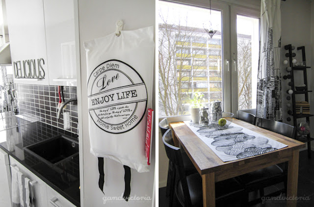 Kuchnia – białe szafki, czarne płytki, czarny blat i aluminiowe dodatki. Jednak wnętrze dopełniają dodatki w odpowiedniej ilości na blacie kuchennym, stole, a także regał drabinka z cotton ballsami (ten sam co w salonie).