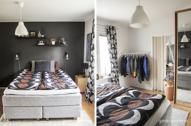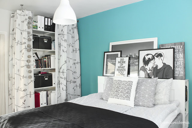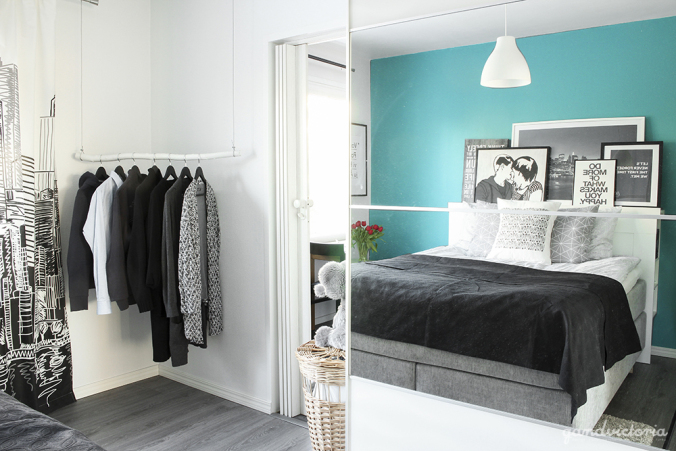 Sypialnia to „rzucająca się w oczy” turkusowa ściana, białe łóżko ze znanej sieciówki, wieszak – garderoba (czyli typowe w skandynawskim stylu eksponowanie ubrań), a także półeczki zakryte zasłonką oraz obrazki na zagłówku łóżka, ścianach. Oczywiście jak zawsze pięknie wygląda bukiet świeżych kwiatów.