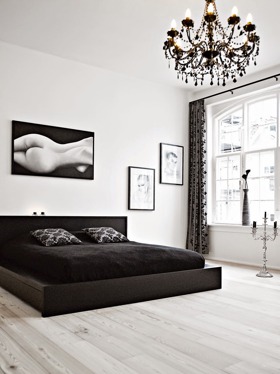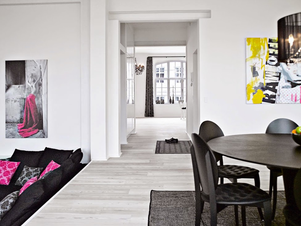 Mieszkanie z przewagą kolorów czarni i bieli. Położone w budynku, w którym wcześniej znajdowała się szkoła, pozostały za to duże stylowe okna. Całość urządzona z zachowaniem minimalizmu, mało mebli i dodatków. Pojawią się tutaj jednak ozdoby w stylu glamour. Choć ten styl to przepych, kontrasty, zdobienia, to wzór na tkaninach, żyrandole czy zdobienia na krzesłach to właśnie styl glamour 🙂