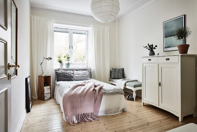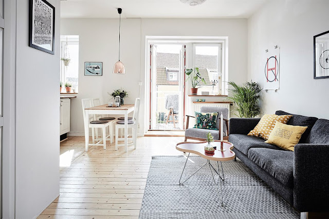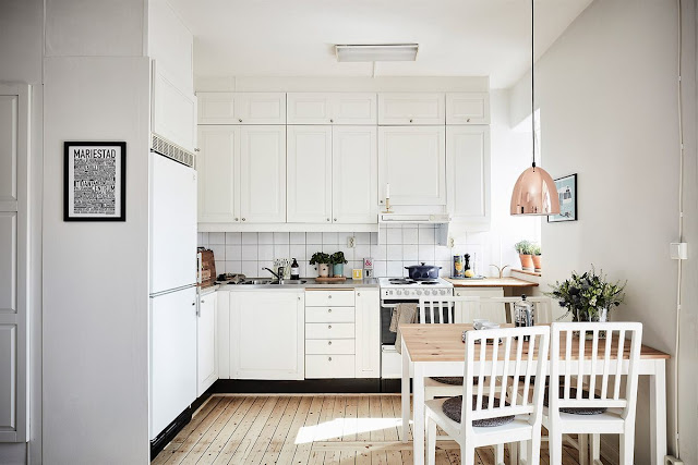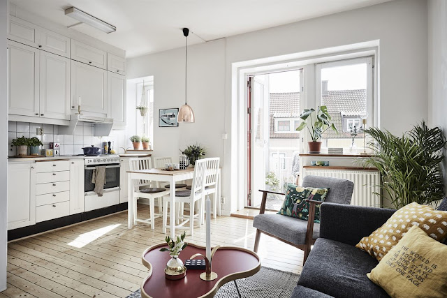 Przestrzeń bardzo dobrze wykorzystana, czyli małe meble (sofa, fotel, a nawet łóżko w sypialni), aneks kuchenny w zabudowie (szafki białe, pod sam sufit, schowki) oraz kapitalny skandynawski styl w aranżacji wnętrz według mnie najlepszy do małych pomieszeń!