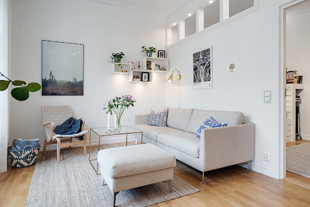 Dwupokojowe mieszkanie: salon z aneksem kuchennym, sypialnia oraz łazienka, garderoba i korytarz. To wszystko zajmuje 42m2 powierzchni, znajduje się w Szwecji, także urządzone zostało w typowym dla tego obszaru skandynawskim stylu.