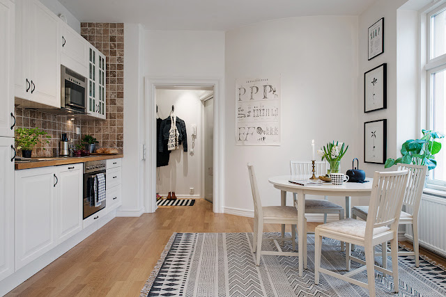 Wygląda jakby układ pomieszczeń został zmieniony, kuchnię otwarto na część dzienną, a sypialnię z garderobą wyodrębniono z salonu (nie ma okien, światło do sypialni wprowadzono z salonu). Dzięki temu stworzono sporą przestrzeń do odpoczynku, zmieścił się tutaj także stylowy okrągły stół z czterema krzesłami. Wnętrze jest utrzymane w jasnych barwach, minimalistyczne, ozdobione roślinami.
