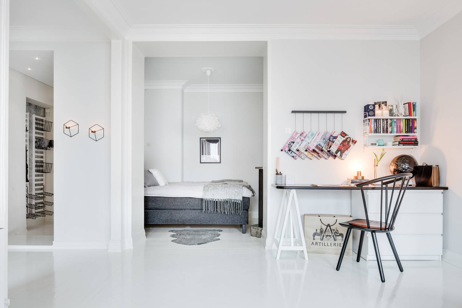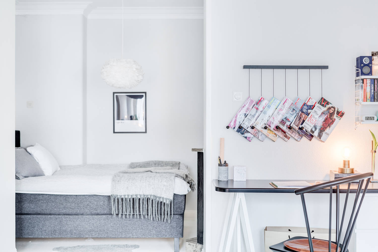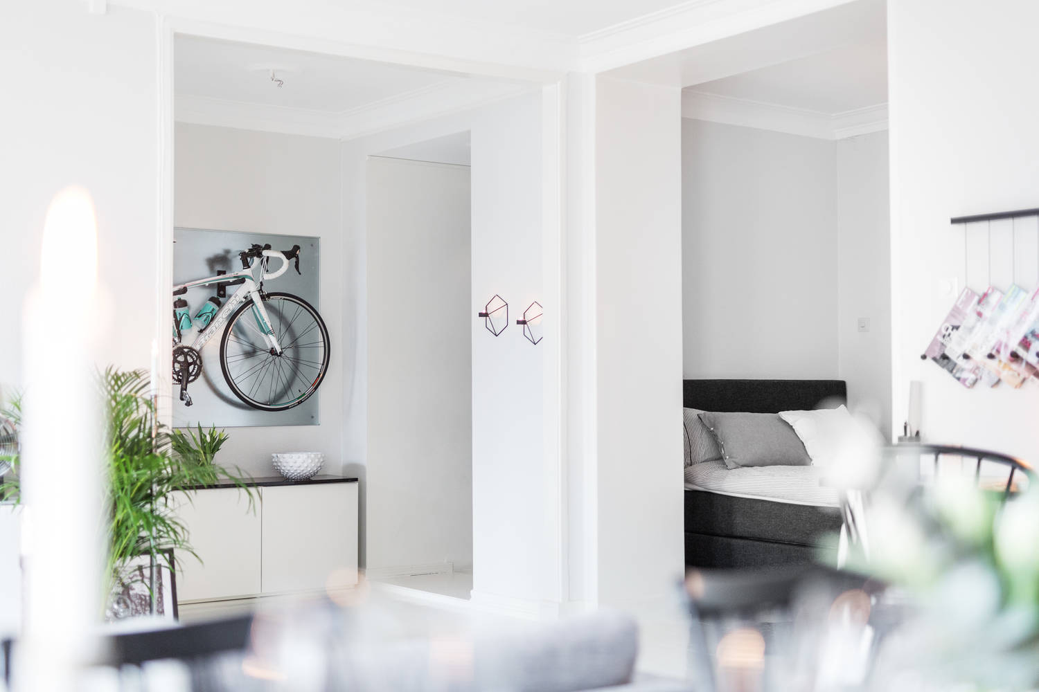 Dekoracje w tym tym mieszkaniu są bardzo delikatne – obrazki w czarnych ramach, rower powieszony na ścianie, a także wyeksponowane magazyny o modzie w miejscu „domowego biura”.