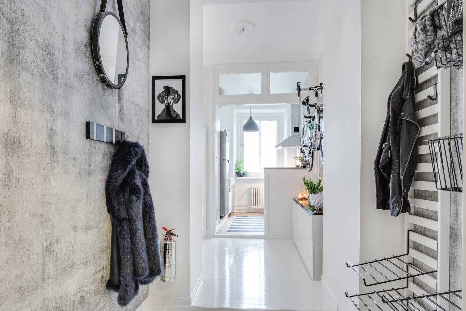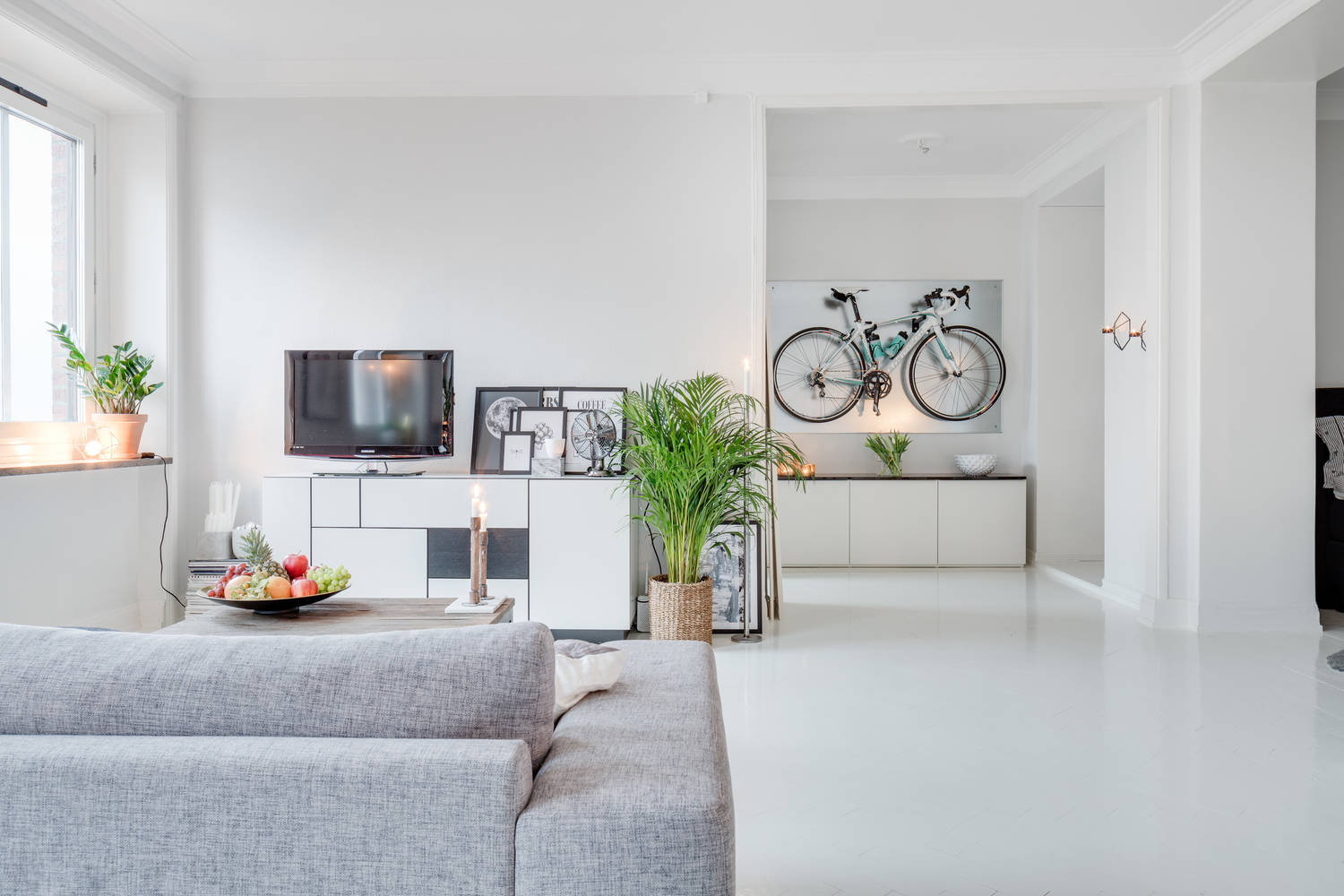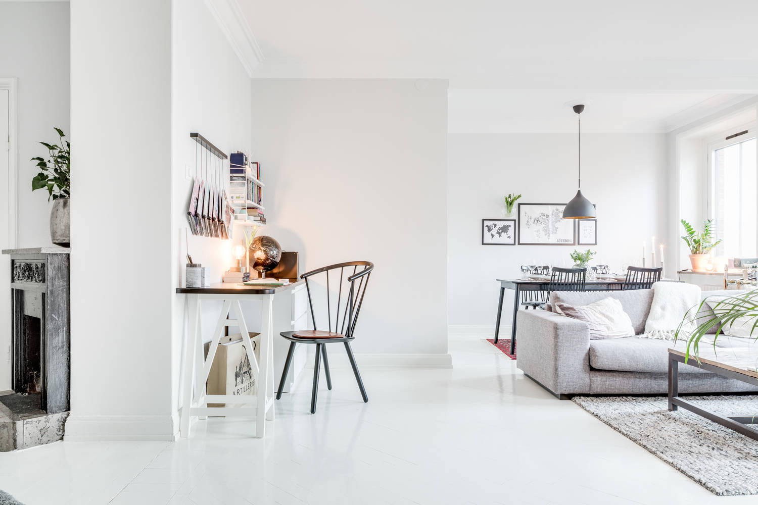 Dekoracje w tym tym mieszkaniu są bardzo delikatne – obrazki w czarnych ramach, rower powieszony na ścianie, a także wyeksponowane magazyny o modzie w miejscu „domowego biura”.