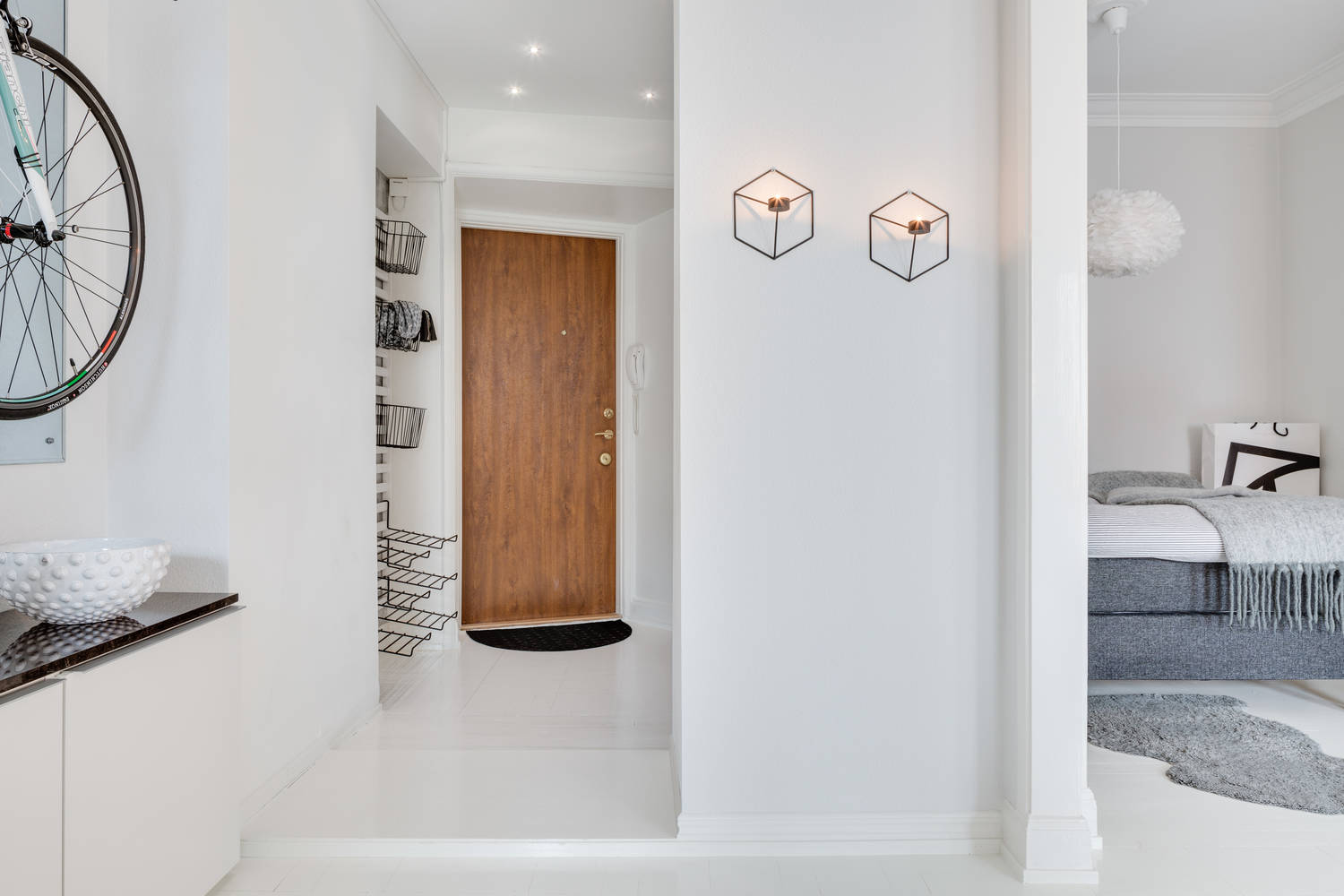 Mieszkanie dwupokojowe, aranżacja wnętrza przeznaczona dla minimalisty. Jasne ściany (białe i jasno- szare) zostały zestawione z białą błyszczącą podłogą. „Surowość” wnętrza uzyskana także dzięki temu, że okien nie zdobią zasłony, anie zdobne firany.